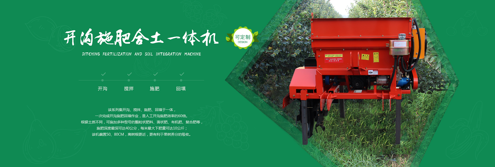 我公司主要经营产品有:果园管理机、拖拉机(窄距拖拉机、小型拖拉机、轮式拖拉机、山地拖拉机、四驱拖拉机)、果园施肥机(开沟施肥合土一体机、偏置开沟施肥复土一体机)、打药机(风送喷雾打药机、小型风送喷雾打药机、大型风送喷雾打药机、果园打药机)、开沟机(中开沟机、偏置开沟机、果园开沟机)、粉碎还田机、果园打草机、碎枝机(大型碎枝机、开荒机、山地开荒机)、旋耕机(1米旋耕机、1.2米旋耕机、1.3米旋耕机、1.4米旋耕机、1.5米旋耕机以及偏置旋耕机)、双铧犁等。不断研制出适应国内现代化果园需求的果园装备系列产品,并取得国家多项专利。